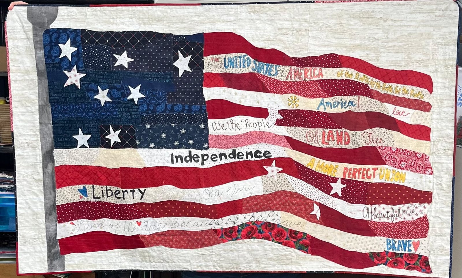 We will be doing a Laura Heine Collage Class. This Wallhanging measures 50.5”x31.5” This is wonderful project to use up some of your scraps. When you sign up, I will give you a supply list of what you need to bring.